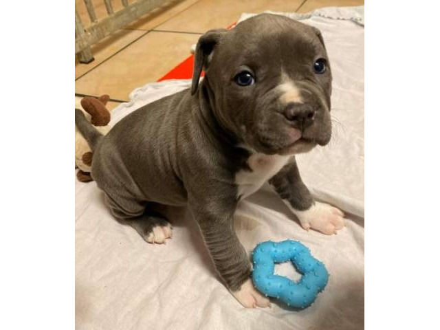 American Pit Bull Welpen Blueline von einem neuen Zuhause. Es ist gemütlich und sehr verspielt. Sie lernt gerade Haustraining, was schon sehr gut funktioniert. Damit du auf die Straße gehen kannst, hat sie etwas gegen Flöhe, Zecken und andere kleine ...
